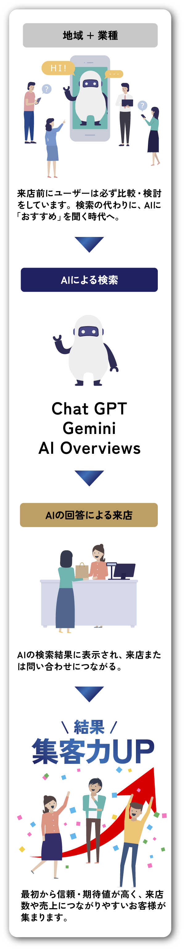 AIは位置情報だけでなく、口コミや評価、さらには専門性まで総合的に分析します。 「地図に表示される」だけでは不十分で、 「AIが信頼し、情報源として参照する」存在であることが重要です。 MEOはあくまで集客の入口の一つ。これからは“AIに選ばれる地域ブランド”でなければ、 次の時代に埋もれてしまいます。