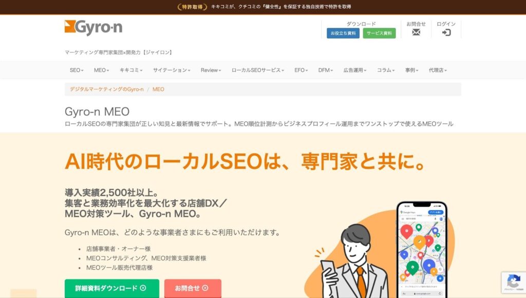 Gyro-n MEO月額1,500円から利用可能。正確な順位計測と強力な口コミ獲得支援